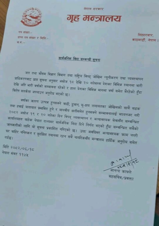 गृह मन्त्रालय स्रोतका अनुसार लगातारको भारी वर्षाले जनजीवन प्रभावित बनेकाले थप दुई दिन सार्वजनिक बिदा दिने निर्णय गरिएको हो।