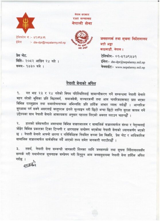 गत भदौ २३ र २४ गतेको विषम परिस्थितिलाई सामान्यीकरण गर्ने सम्बन्धमा नेपाली सेनाले वहन गरेको भूमिकाप्रति विद्वत्वर्ग, समाजसेवी, सञ्चारकर्मी तथा आमनागरिकबाट प्राप्त भएका विभिन्न राय, सुझाव तथा समालोचनात्मक अभिव्यक्तिप्रति आभारसमेत व्यक्त गरेको छ ।