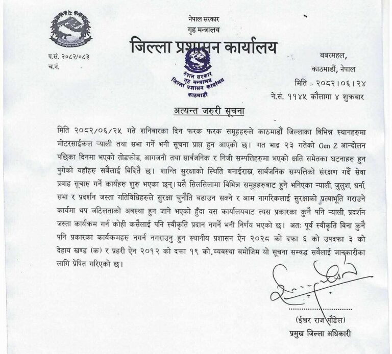 काठमाडौँका प्रमुख जिल्ला अधिकारी ईश्वरराज पौडेलले शुक्रबार एक सूचना जारी गर्नुहुँदै कुनै पनि समूह वा सङ्गठनलाई र्याली, जुलुस र सभा जस्ता कार्यक्रम गर्न रोक लगाउनुभएको हो ।