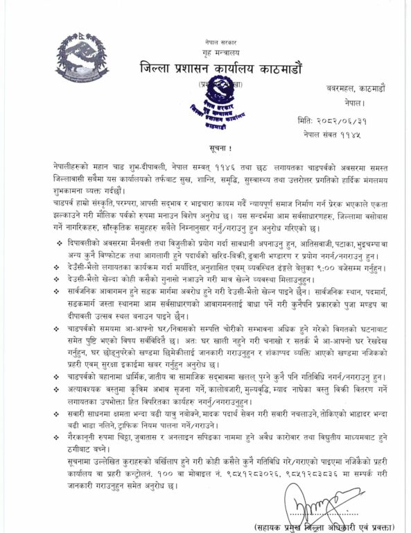 काठमाडौँ,कात्तिक १ — जिल्ला प्रशासन कार्यालय काठमाडौँले आगामी दुई महिनासम्म काठमाडौँका विभिन्न क्षेत्रमा भेला, प्रदर्शन, धर्ना र जुलुस गर्न निषेध आदेश जारी गरेको छ। प्रमुख जिल्ला अधिकारी ईश्वरराज पौडेलले शुक्रबार जारी गरेको आदेश अनुसार पाँच जनाभन्दा बढी व्यक्ति भेला भई अनशन, घेराउ, जुलुस, प्रदर्शन तथा सभा गर्न प्रतिबन्ध लगाइएको हो।