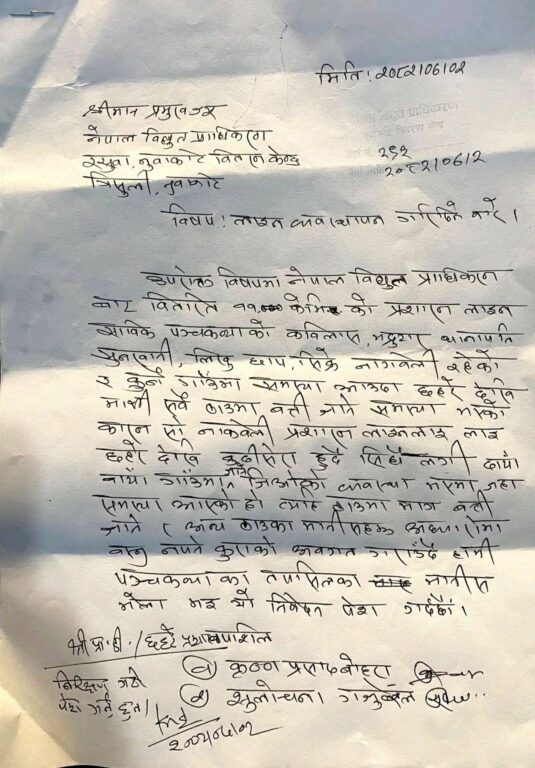 आइतबार नेपाल विद्युत प्राधिकरण प्रमुखलाई सम्बोधन गरी पठाइएको पत्रमा ११ केभी क्षमताको प्रसारण लाइन साविक पञ्चकन्या क्षेत्रअन्तर्गत कविलास, भद्रुटार, थानापति, सुननखानी, लिखु, छाप, सिक्रे हुँदै सुदुर पूर्वी क्षेत्र जोड्ने बिजुली छहरे बजारदेखि बारम्बार समस्या देखिएको उल्लेख गरिएको छ।