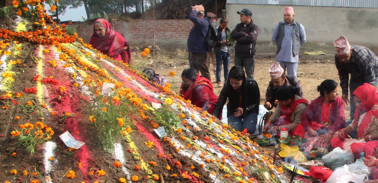 गाउँघरमा गोबरको एउटा सानो पहाडजस्तो थुम्को बनाउने, त्यो थुम्कोको टुप्पामा सानो खाल्डो पारेर पानी राख्ने र पूजा गर्ने चलन छ । यसले वर्षातको भयबाट मान्छेलाई सुरक्षित राख्छ भन्ने मान्यता छ । खासगरी पशुपालक, गौपालक किसानले यस पर्वलाई विशेष महत्व दिने गरेका छन् ।