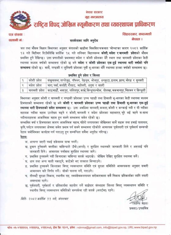 काठमाडौं,कात्तिक ११— बंगालको खाडीमा विकसित चक्रवात ‘मोन्था’ का कारण आगामी दिनमा नेपालको पूर्वी र मध्य भागको मौसम प्रभावित हुने भएको छ। जल तथा मौसम विज्ञान विभागका अनुसार चक्रवातको प्रभाव २०८२ कार्तिक १३ गते बिहीबार दिउँसोदेखि १५ गते शनिबार बिहानसम्म रहने अनुमान गरिएको छ।