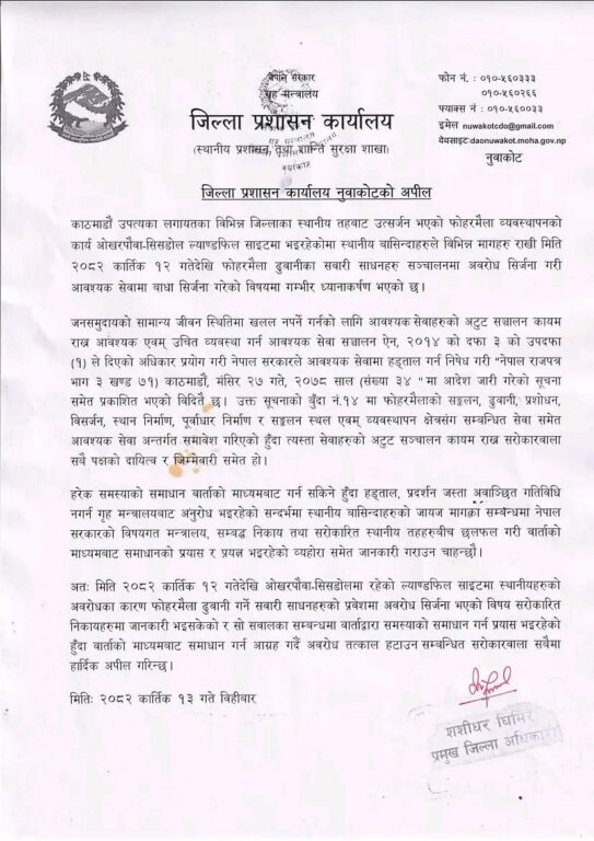 नुवाकोट,कात्तिक १३ । नुवाकोट जिल्लाको ओखरपौवा–सिसडोल क्षेत्रमा रहेको व्यावसायिक ल्याण्डफिट साइट (फोहोर व्यवस्थापन साइट) सञ्चालन अवरुद्ध भएपछि सेवाग्राहीले भोगिरहेको समस्यालाई समाधान गर्ने उद्देश्यले नुवाकोट प्रशासन सक्रिय बनेको छ। कात्तिक १२ गतेदेखि फोहोर बोकेर आउने सवारी साधनको आवतजावत रोकिएको कारण सङ्कलन तथा व्यवस्थापन प्रभावित भएपछि प्रशासनले विज्ञप्ति जारी गर्दै समस्यालाई तत्काल समाधान गर्न सम्बन्धित निकायलाई आग्रह गरेको हो।
