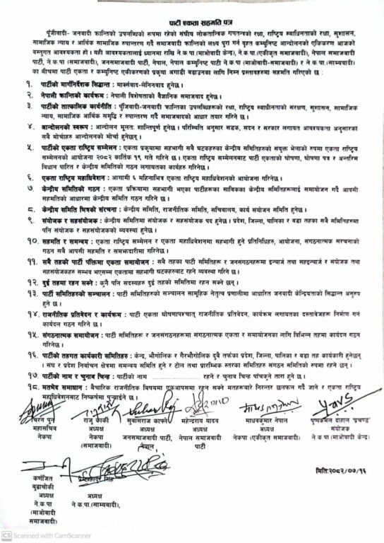 काठमाडौं,कात्तिक १६ । देशका आठ वटा कम्युनिष्ट पार्टीहरूले संयुक्त रुपमा पार्टी एकता गर्ने सहमति गरेका छन्। नेकपा माओवादी केन्द्रको केन्द्रीय कार्यालय पेरिसडाँडामा बसेको छलफलपछि दलहरूले एकताको सहमतिपत्रमा हस्ताक्षर गर्दै एकीकरण प्रक्रियालाई औपचारिकताको चरणमा प्रवेश गराएका हुन्।