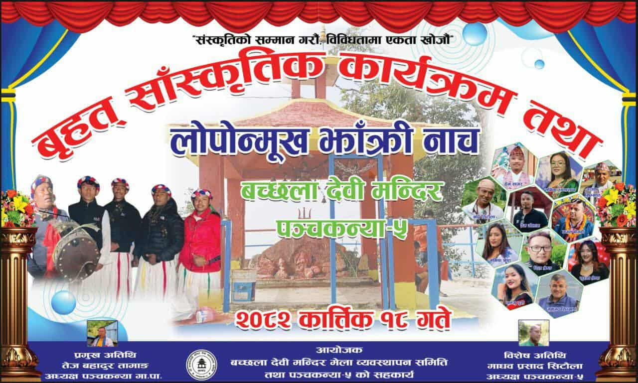 नुवाकोट, कात्तिक १८ । जिल्लाको पञ्चकन्या गाउँपालिका–५ भद्रुटार चुहानडाडास्थित बच्छलादेवी मन्दिर परिसरमा आजदेखि सुरु हुने वार्षिक मेला भव्य रूपमा मनाइने भएको छ। मेलाको तयारी अन्तिम चरणमा पुगेसँगै भक्तजनहरूको ठूलो भीड आउने अपेक्षा गरिएको मन्दिर संरक्षण समितिले जनाएको छ।