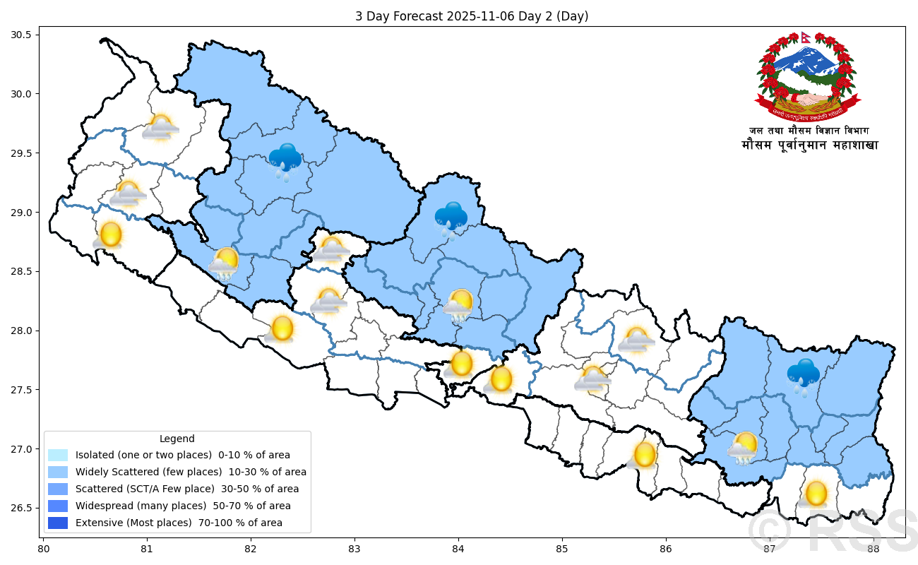 महाशाखाका अनुसार कोशी, गण्डकी र कर्णाली प्रदेशका पहाडी भागका एकदुई स्थानमा हल्का वर्षा र हिमपातको सम्भावना छ ।