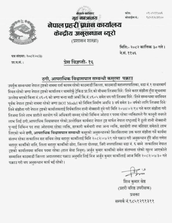 काठमाडौं,कात्तिक ३० । नेपाल प्रहरीको केन्द्रीय अनुसन्धान ब्यूरो (सीआईबी) ले नेपाल ट्रष्ट कार्यालयका तत्कालीन सचिव हाल सेवानिवृत्त अर्जुन कार्कीलाई पक्राउ गरेको छ । कार्कीलाई आइतबार साँझ पक्राउ गरेको सीआईबी जनाएको छ ।