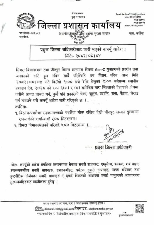 बारा,मंसिर ४ । जिल्ला प्रशासन कार्यालय बाराले सिमरामा आज पनि कर्फ्यु आदेश जारी गरेको छ ।