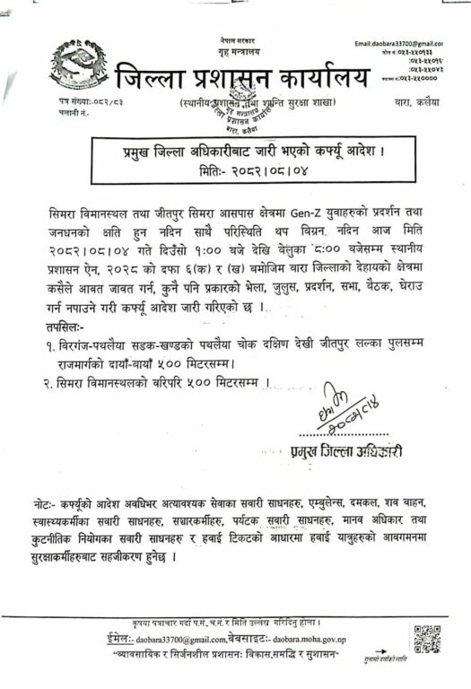 सिमरा चोक र आसपासका क्षेत्रमा भइरहेको प्रदर्शनले वातावरण तनावग्रस्त बनेपछि जिल्ला प्रशासन कार्यालय बाराले बिहीबार पुनः सूचना जारी गर्दै कर्फ्यू आदेशलाई निरन्तरता दिएको छ। प्रशासनले सार्वजनिक सुरक्षा र शान्ति-व्यवस्था कायम गर्न कफ्यू आदेश पालना गर्न सबैलाई आग्रह गरेको छ।
