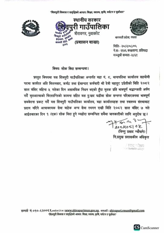 नुवाकोटको शिवपुरी गाउँपालिकामा मङ्सिर ७ गते शोक बिदा
