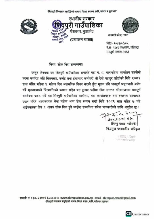 नुवाकोट, मंसिर ७। शिवपुरी गाउँपालिकाले वडा नम्बर ८ मा कार्यरत कर्मचारी देवीबहादुर उप्रेती (बासु)को असामयिक निधनमा आज शोक बिदा दिएको छ।