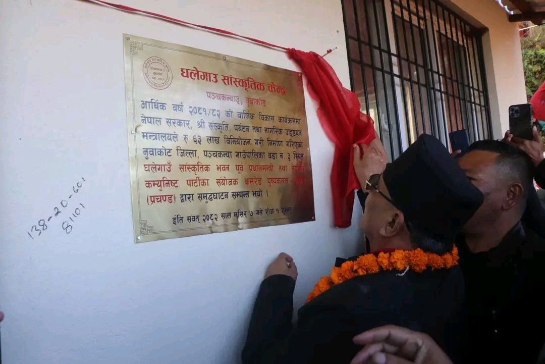 नुवाकोट, मंसिर ७ । नेपाली कम्युनिष्ट पार्टी (नेकपा)का संयोजक तथा पूर्वप्रधानमन्त्री पुष्पकमल दाहाल ‘प्रचण्ड’ले आइतबार नुवाकोटको पञ्चकन्या गाउँपालिका–३, घलेभञ्याङस्थित ‘घलेगाउँ सांस्कृतिक भवन’को उद्घाटन गर्नुभएको छ।
