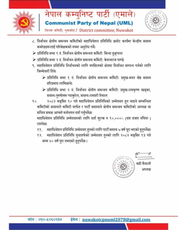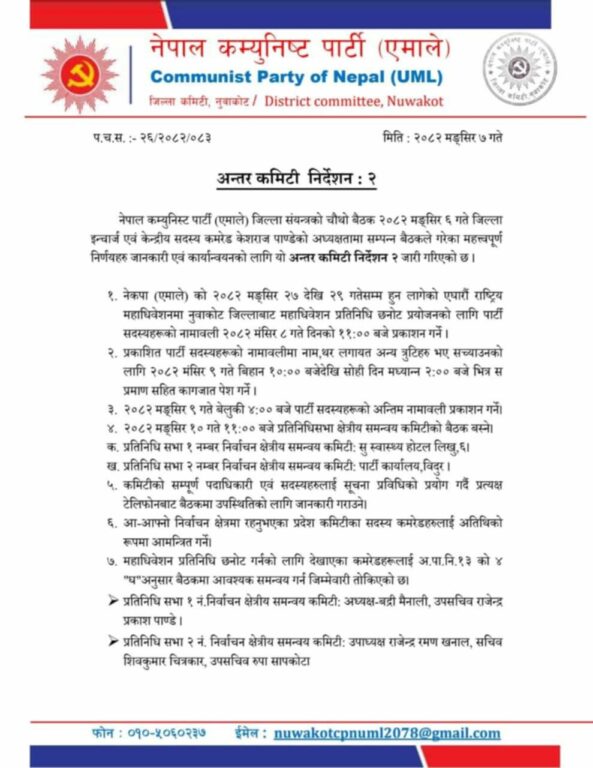 एमालेले मंसिर १३ गते देशभर एकैदिन महाधिवेशन प्रतिनिधि छान्ने कार्यक्रम तय गरेको छ। ६ लाख ६७ हजार सदस्यमध्ये करिब एक हजार प्रतिनिधि चयन हुनेछन्। सो अनसार जिल्ला कमिटी नुवाकोटले अन्तर–कमिटी निर्देशन–२ जारी गर्दै निर्वाचन तालिका सार्वजनिक गरेको छ।