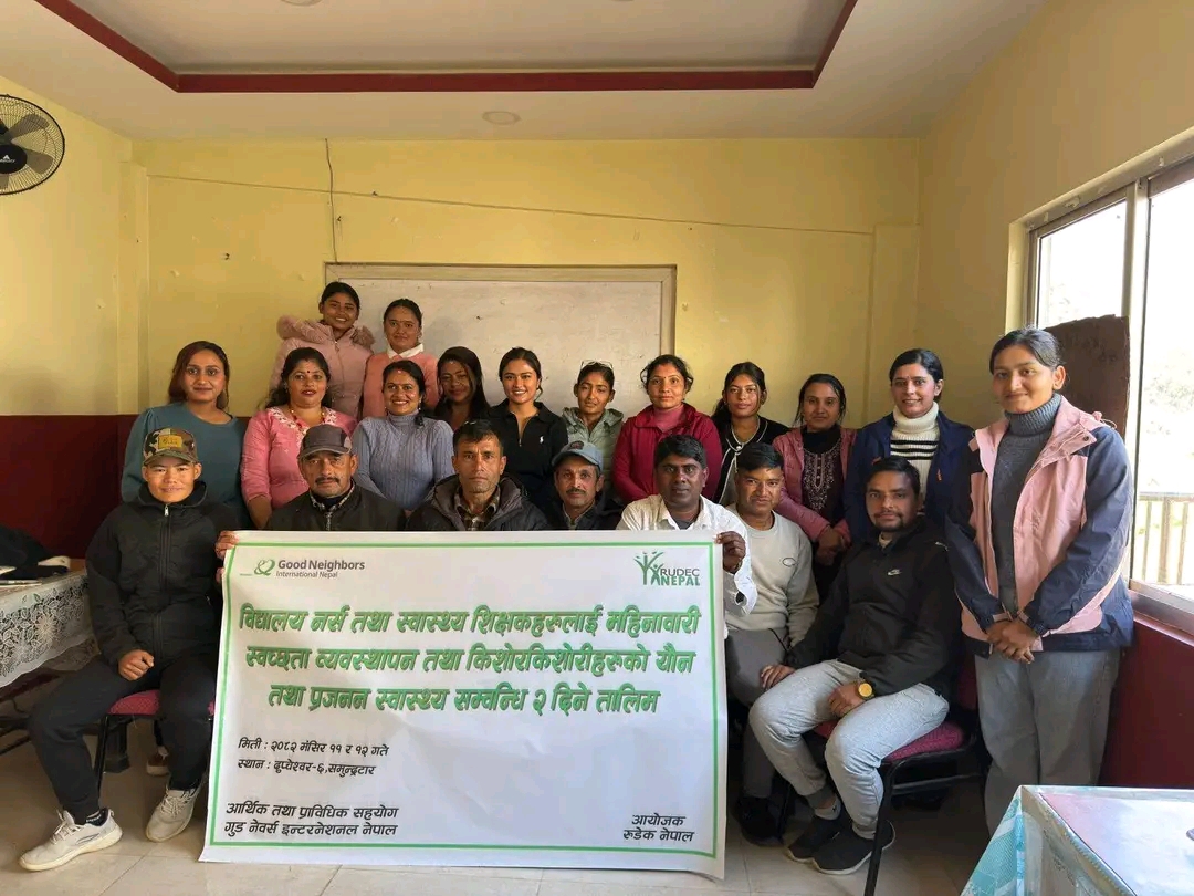 नुवाकोट,मंसिर १३ — पञ्चकन्या गाउँपालिका र दुप्चेश्वर गाउँपालिका अन्तर्गतका विद्यालयमा कार्यरत विद्यालय नर्स र स्वास्थ्य शिक्षा अध्यापन गर्ने शिक्षकहरूलाई लक्षित गरी आयोजित महिनावारी स्वच्छता तथा किशोर–किशोरीको यौन तथा प्रजनन स्वास्थ्यसम्बन्धी दुई दिने तालिम सम्पन्न भएको छ। तालिम मङ्सिर ११ र १२ गते सञ्चालन गरिएको थियोे ।