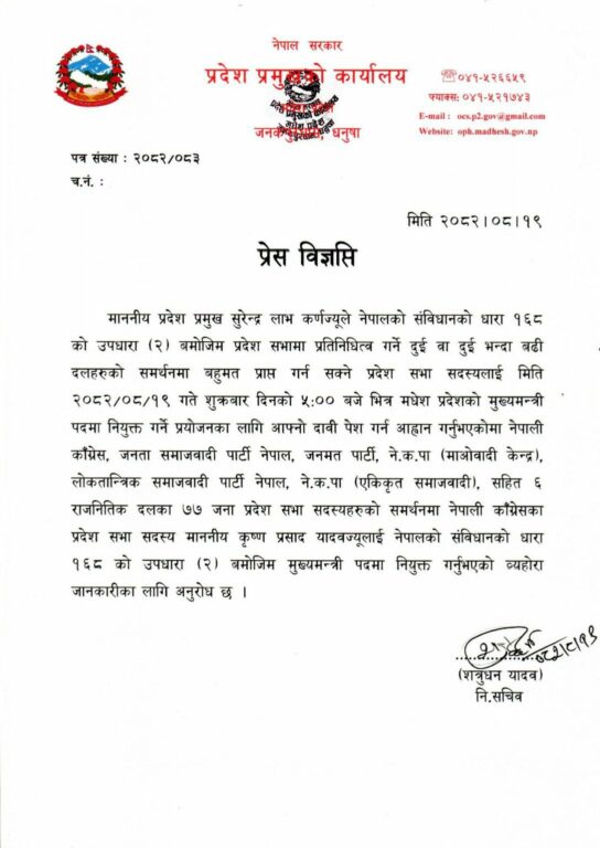 मधेस प्रदेश प्रमुख सुरेन्द्रलाल कर्णले नेपालको संविधान ६८ को २ बमोजिम यादवलाई मधेश प्रदेशको मुख्य मन्त्रीमा नियुक्त गर्नु भएको हो ।