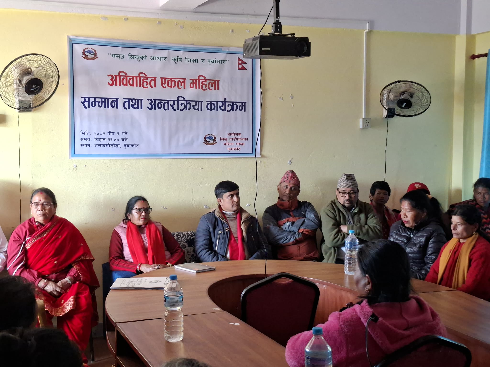 नुवाकोट,पुस ७ । लिखु गाउँपालिकाले ४० वर्ष नाघेका तर अझै अविवाहित रहेका एकल महिलालाई सम्मान गर्दै उनीहरूका समस्या, चुनौती र समाधानका विषयमा अन्तरक्रिया कार्यक्रम सम्पन्न गरेको छ ।
