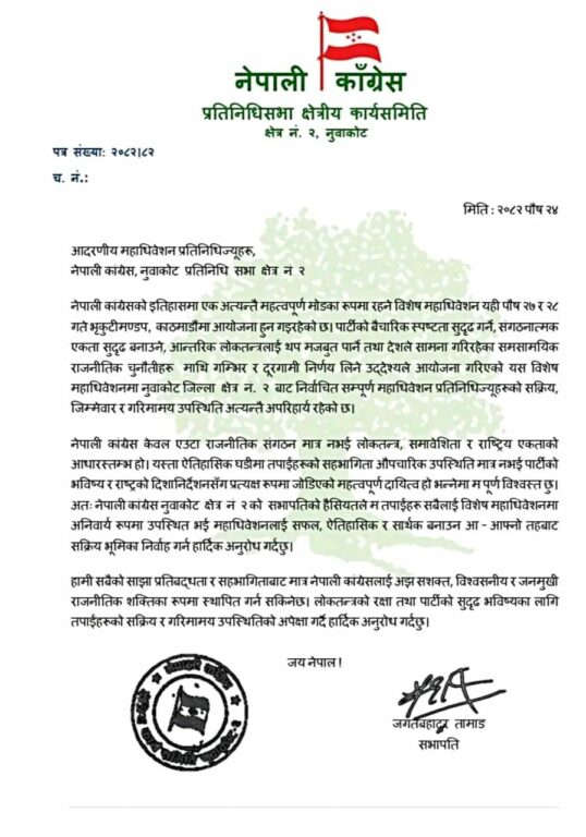 क्षेत्र नं २ का क्षेत्रीय अध्यक्ष जगतबहादुर तामाङले विशेष महाधिवेशनमा सहभागिता जनाउन महाधिवेशन प्रतिनिधि तथा पार्टीका क्रियाशील सदस्यहरूलाई अपिल जारी गर्नुभएको छ। उहाँले वर्तमान अवस्थामा नेपाली कांग्रेसलाई यथास्थितिमा राख्ने कि परिवर्तनसहित नयाँ नेतृत्वमार्फत निर्वाचनमा जाने भन्ने विषय निर्णायक भएकाले विशेष महाधिवेशनमार्फत परिवर्तनको पक्षमा उभिन आग्रह गर्नुभएको छ।