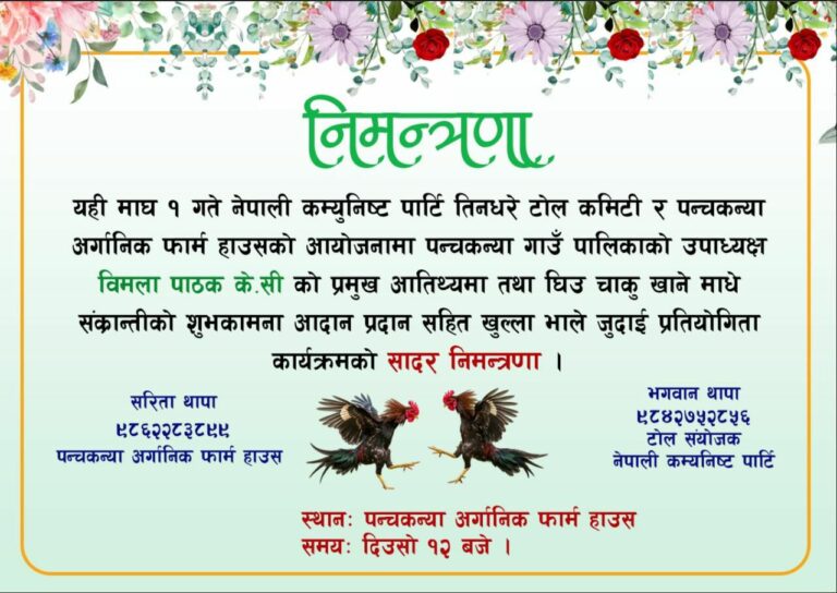 नेपाली कम्युनिस्ट पार्टी तिनघरे टोल समितिका संयोजक भगवान थापा र पञ्चकन्या अर्गानिक फार्म हाउसकी सञ्चालक सरिता थापाको संयुक्त आयोजनामा उक्त कार्यक्रम माघ १ गते हुने भएको हो ।