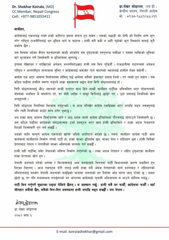 काठमाडौँ,माघ १। नेपाली कांग्रेसका नेता डा. शेखर कोइरालाले पार्टीलाई एकतावद्ध राख्ने प्रयास सफल हुन नसकेको स्वीकार गर्दै आसन्न निर्वाचनमा कांग्रेस एक भएर अघि बढ्नुपर्नेमा जोड दिनुभएको छ। सामाजिक सञ्जाल फेसबुकमा बिहीबार स्टाटस लेख्दै डा. कोइरालाले कांग्रेसभित्र देखिएको विभाजनलाई “नियतिको कठोर सत्य” का रूपमा व्याख्या गर्नुभएको छ।