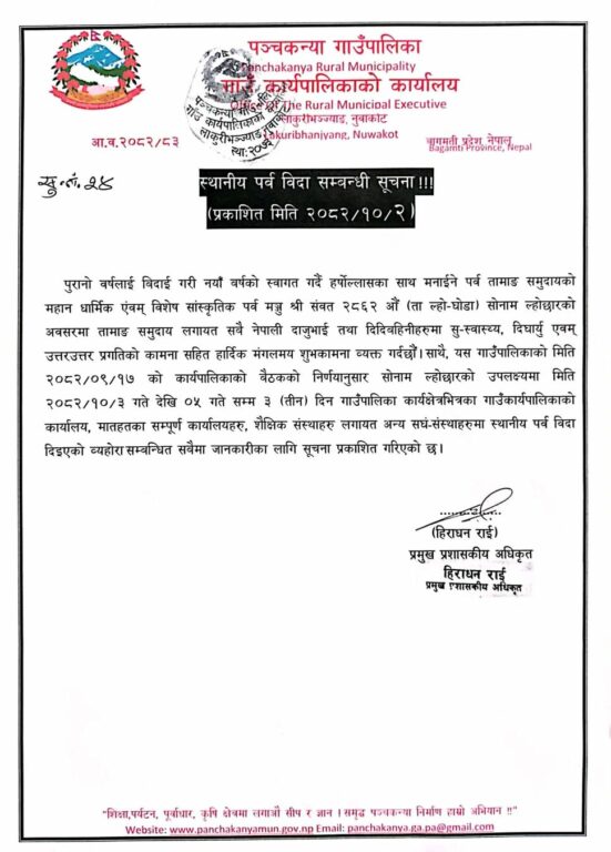 नुवाकोट, माघ २ । जिल्लाको पञ्चकन्या गाउँपालिकाले तामाङ समुदायको महान धार्मिक तथा सांस्कृतिक पर्व सोनाम ल्होछारको अवसरमा तीन दिन सार्वजनिक बिदा दिने निर्णय गरेको छ।