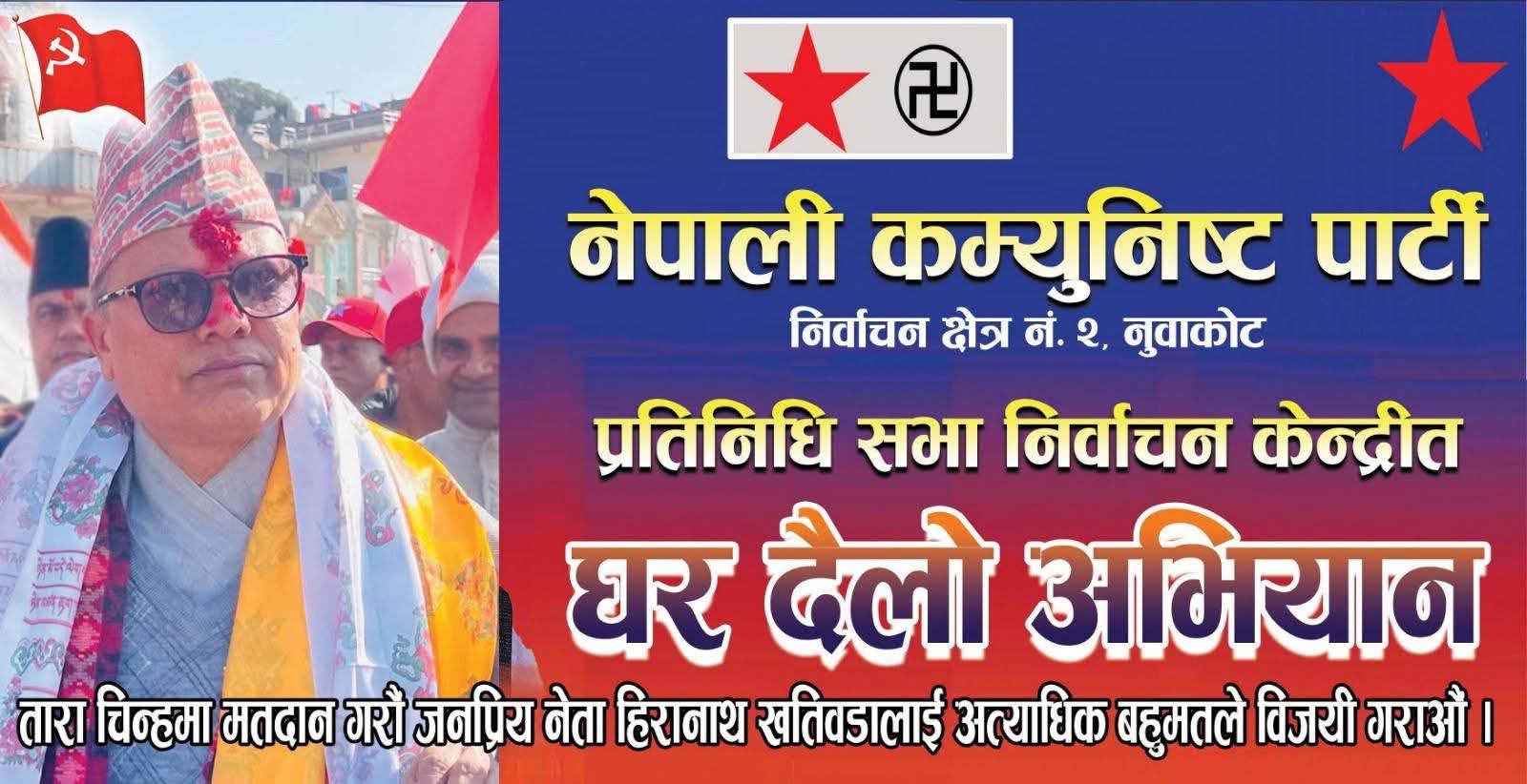 नेपाली कम्युनिष्ट पार्टी (तारा चिन्ह) का तर्फबाट उम्मेदवार खतिवडाले विदुर–४ बट्टार दम्की मा जम्मा भई बट्टार, इनारपाटी, पिपलटार लगायत वडा नं. ४, ५ र ६ का विभिन्न स्थानमा मतदातासँग प्रत्यक्ष भेटघाट तथा छलफल गर्ने कार्यक्रम तय भएको जनाइएको छ।