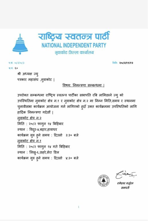 पार्टीका अनुसार नुवाकोट क्षेत्र नम्बर २ अन्तर्गत विदुर–४ बट्टारस्थित हावाघरमा दिउँसो ३:३० बजे चुनावी सभा सुरु हुनेछ। त्यसपछि सोही दिन नुवाकोट क्षेत्र नम्बर १ अन्तर्गत लिखु–६ छहरेमा दिउँसो ४:३० बजे अर्को सभा आयोजना गरिनेछ।