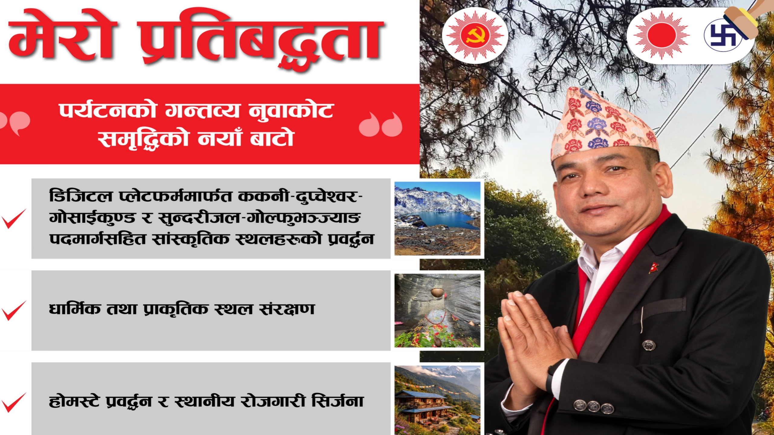 नुवाकोट,फागुन १५ – नुवाकोट प्रतिनिधिसभा क्षेत्र नं. १ का उम्मेदवार बद्री मैनालीले पर्यटन क्षेत्रलाई जिल्लाको समृद्धिको प्रमुख आधारका रूपमा अघि सार्दै आफ्नो प्रतिबद्धता सार्वजनिक गरेका छन्। “पर्यटन” शीर्षकअन्तर्गत उनले नुवाकोटलाई आकर्षक तथा व्यवस्थित पर्यटन गन्तव्यका रूपमा विकास गर्ने योजना प्रस्तुत गरेका हुन्।