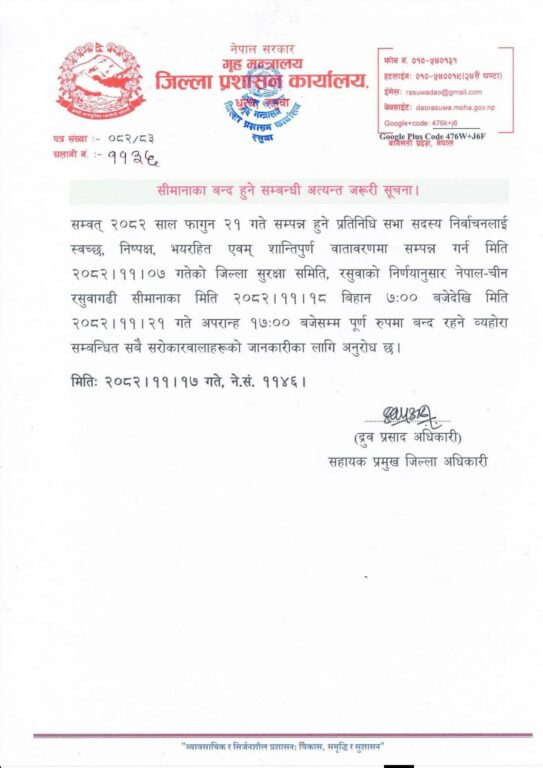 रसुवा,फागुन १८— प्रतिनिधि सभा सदस्य निर्वाचन २०८२ लाई स्वच्छ, निष्पक्ष, भयरहित तथा शान्तिपूर्ण वातावरणमा सम्पन्न गराउने उद्देश्यले नेपाल–चीन रसुवागढी सीमानाका अस्थायी रूपमा बन्द गरिएको छ।