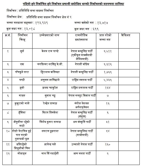 मतगणना जारी रहेकाले थप परिणाम क्रमशः सार्वजनिक हुँदै जाने निर्वाचन अधिकृतको कार्यालयले जनाएको छ।