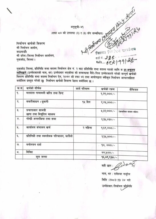 नुवाकोट–२ बाट निर्वाचित डा. अचुतम लामिछानेको चुनाव खर्च १६ लाख ९ हजार ९३० रुपैयाँ