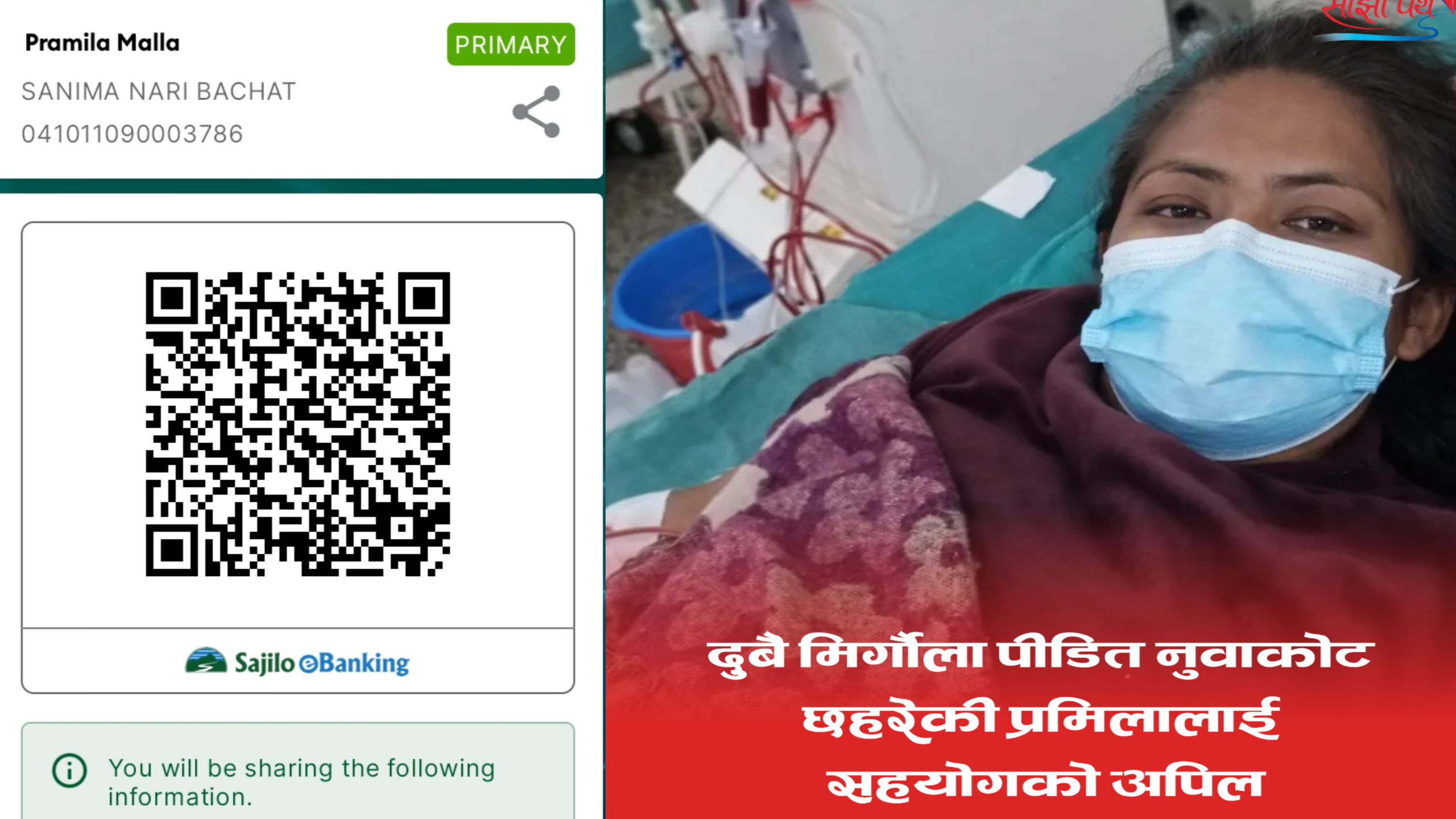 प्रमिलालाई सहयोग गर्न चाहनेले सानिमा बैंकको खाता नम्बर ०४१०११०९०००३७८६ मा आर्थिक सहयोग गर्न सक्नेछन्। साथै उपलब्ध क्यूआर कोडमार्फत डिजिटल माध्यमबाट पनि सहयोग गर्न सकिने बताइएको छ। आज प्रमिलाको परिवारको एउटै आशा छ— देशविदेशमा रहेका सहयोगी मनहरूले हात बढाइदिए भने सायद एक युवतीको जीवन फेरि उज्यालो हुन सक्छ।