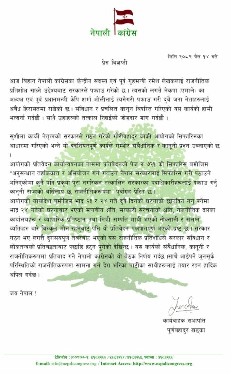 नेता पूर्णबहादुर खड्काले कार्यवाहक सभापतिको हैसियतमा विज्ञप्ति जारी गर्दै संविधानको मर्मविपरीत लेखकलाई पक्राउ गरेको भन्दै तत्काल रिहा गर्न माग गर्नु भएको छ ।