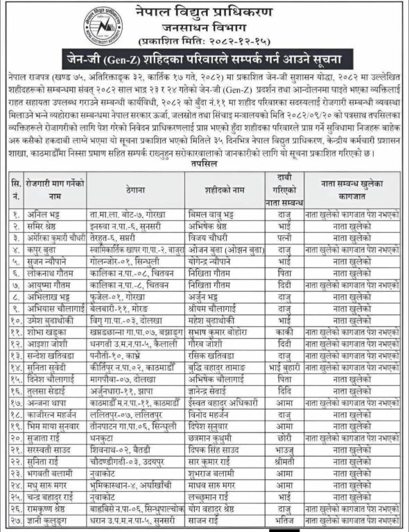 काठमाडौँ,चैत १५— जेनजी आन्दोलनमा शहीद भएका २७ जनाका परिवारका सदस्यले नेपाल विद्युत प्राधिकरणमा रोजगारी पाउने भएका छन्।