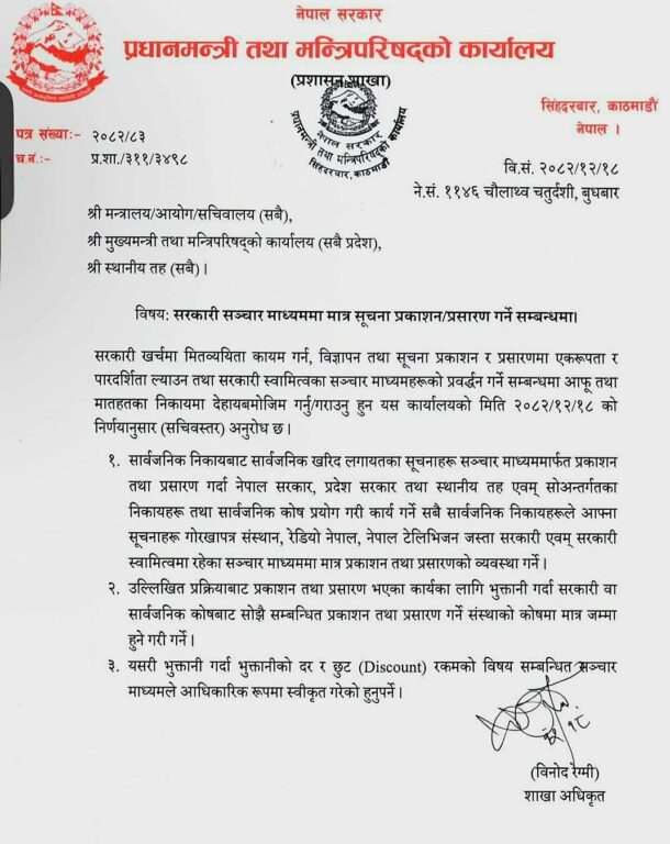 प्रधानमन्त्री तथा मन्त्रिपरिषदको कार्यालयले एक पत्र जारी गर्दै सरकारी खर्चमा मितव्ययिता कायम गर्न, विज्ञापन तथा सूचना प्रकाशन र प्रसारणमा एकरूपता र पारदर्शिता ल्याउन तथा सरकारी स्वामित्वका सञ्चार माध्यमहरूको प्रवर्द्धन गर्ने विषय उल्लेख गरिएका छन।