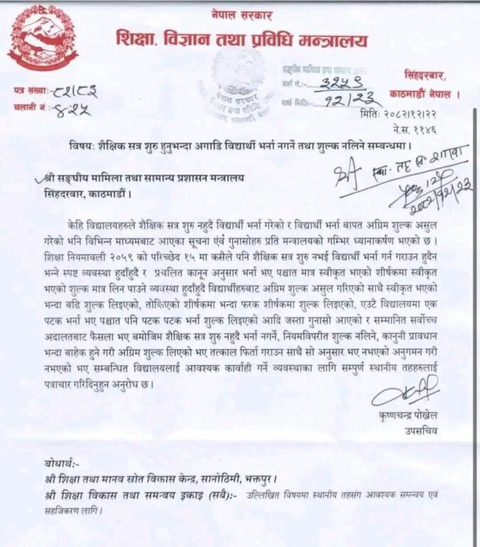 मन्त्रालयले शैक्षिक सत्र सुरु हुनुअघि विद्यार्थी भर्ना नगर्नसमेत स्पष्ट निर्देशन जारी गरेको छ।