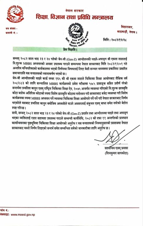 काठमाडौँ, चैत २९ — शिक्षा, विज्ञान तथा प्रविधि मन्त्रालय ले जेनजी आन्दोलनकी घाइते एकता शाहलाई निःशुल्क एमबिबीएस अध्ययनको अवसर दिने निर्णय ऐन नियम विपरीत नभएको स्पष्ट पारेको छ।