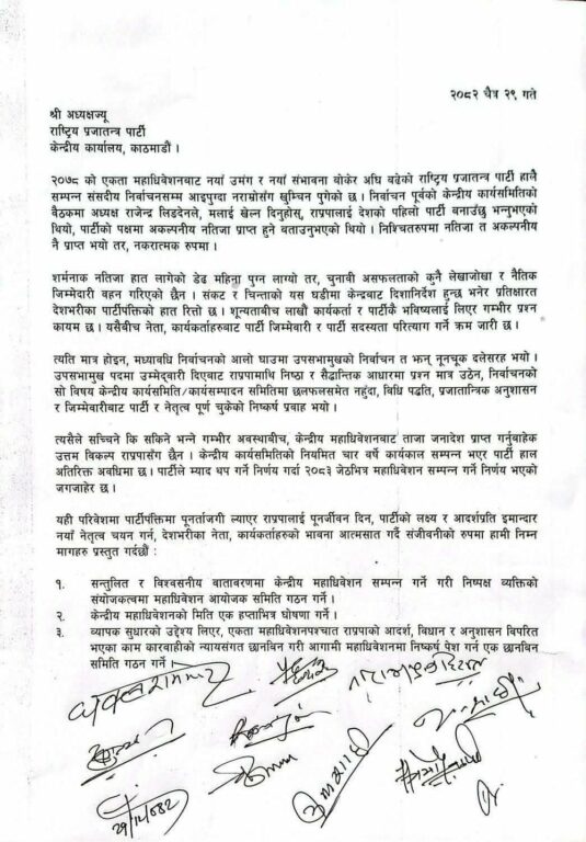 काठमाडौं,चैत २९ । राष्ट्रिय प्रजातन्त्र पार्टी (राप्रपा) भित्रको आन्तरिक विवाद सतहमा आएको छ। पार्टीका महामन्त्री धवल शमशेर राणा को नेतृत्वमा आइतबार काठमाडौंमा आयोजित भेलाले एक साताभित्र महाधिवेशनको मिति घोषणा गर्न माग गरेको छ।