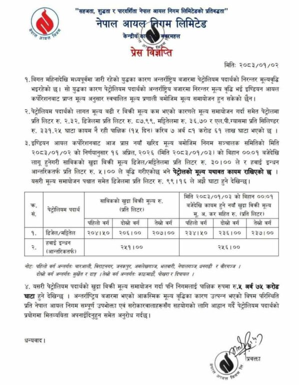 पेट्रोलियम पदार्थको मूल्य पुनः वृद्धि, निगम अझै घाटामा