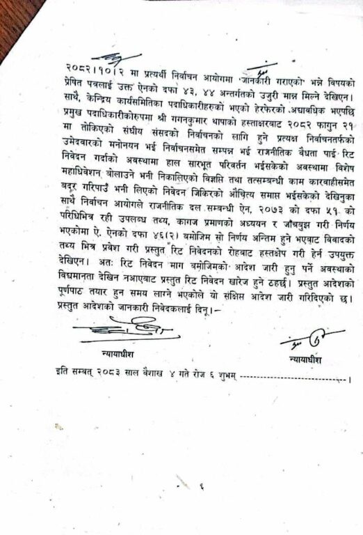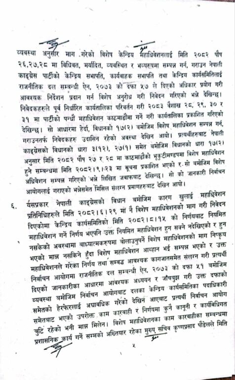 न्यायाधीश शारंगा सुवेदी र नृपध्वज निरौलाको इजलासले कांग्रेसका तत्कालीन कार्यवाहक सभापति पूर्णबहादुर खड्काले दायर गरेको रिट खारेज गरेको छ। यससँगै पार्टीभित्रको विवादमा महत्वपूर्ण कानुनी टुंगो लागेको छ।