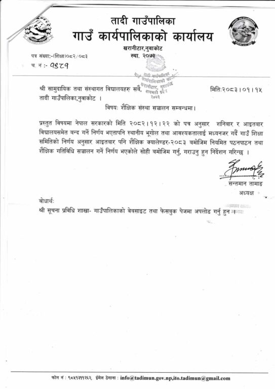 नुवाकोट, वैशाख १५ — नुवाकोटको तादी गाउँपालिकाले आइतबार पनि विद्यालय सञ्चालन गर्ने निर्णय गरेको छ। गाउँपालिकाले मंगलबार सूचना जारी गर्दै शैक्षिक गतिविधि नियमित रूपमा सञ्चालन गर्न निर्देशन दिएको हो।