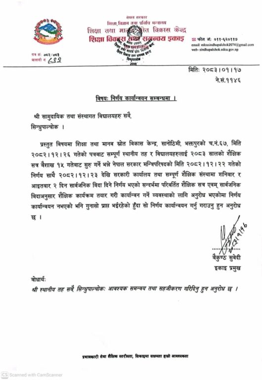 सिन्धुपाल्चोक, वैशाख १७ । जिल्ला शिक्षा समन्वय इकाई सिन्धुपाल्चोकले केन्द्र सरकारको निर्णय कार्यान्वयन गर्न स्थानीय तह तथा विद्यालयहरूलाई अनुरोध गरेको छ।