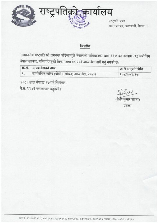 काठमाडौँ, वैशाख १७। राष्ट्रपति रामचन्द्र पौडेलले दोस्रो अध्यादेश जारी गरेका छन्। राष्ट्रपतिले बिहीवार राति सार्वजनिक खरिद (दोस्रो संशोधन) अध्यादेश, २०८३ जारी गरेका हुन्।