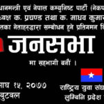 रूपन्देही माघ १५ । प्रतिनिधिसभा विघटनविरुद्ध आन्दोलनरत नेकपाले बिहीबार बुटवलमा विरोध सभा गर्दैछ । नेकपा संघर्ष समिति लुम्बिनी प्रदेश कमिटीको आयोजनामा दिउँसो १ बजे विरोध सभा सुरु हुने जनाइएको छ